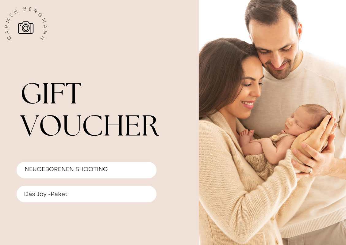 Die Gutscheine für Neugeborene Shootings von Carmen Bergmann Studio sind ideale Geschenke für Familien, die sich an den besonderen Moment der Geburt ihres Babys erinnern möchten. Unsere Gutscheine werden schnell versendet, innerhalb von nur 2-6 Stunden nach ihrer Bezahlung. Außerdem, wenn Sie ein elektronisches Format bevorzugen, sind die Gutscheine sofort verfügbar, im Moment der Bestellbezahlung. Mit einem eleganten Design, sind die Gutscheine von Carmen Bergmann Studio ein perfektes ästhetisches Geschenk für Freunde und Familie. Ein wichtiger Vorteil unserer Gutscheine ist ihre unbegrenzte Gültigkeit. Falls sie nicht für ein Fotoshooting mit dem Neugeborenen verwendet werden, können sie für ein Familienshooting, eine spezielle Weihnachtsfotosession oder sogar für eine weitere Mutterschaftssitzung genutzt werden.